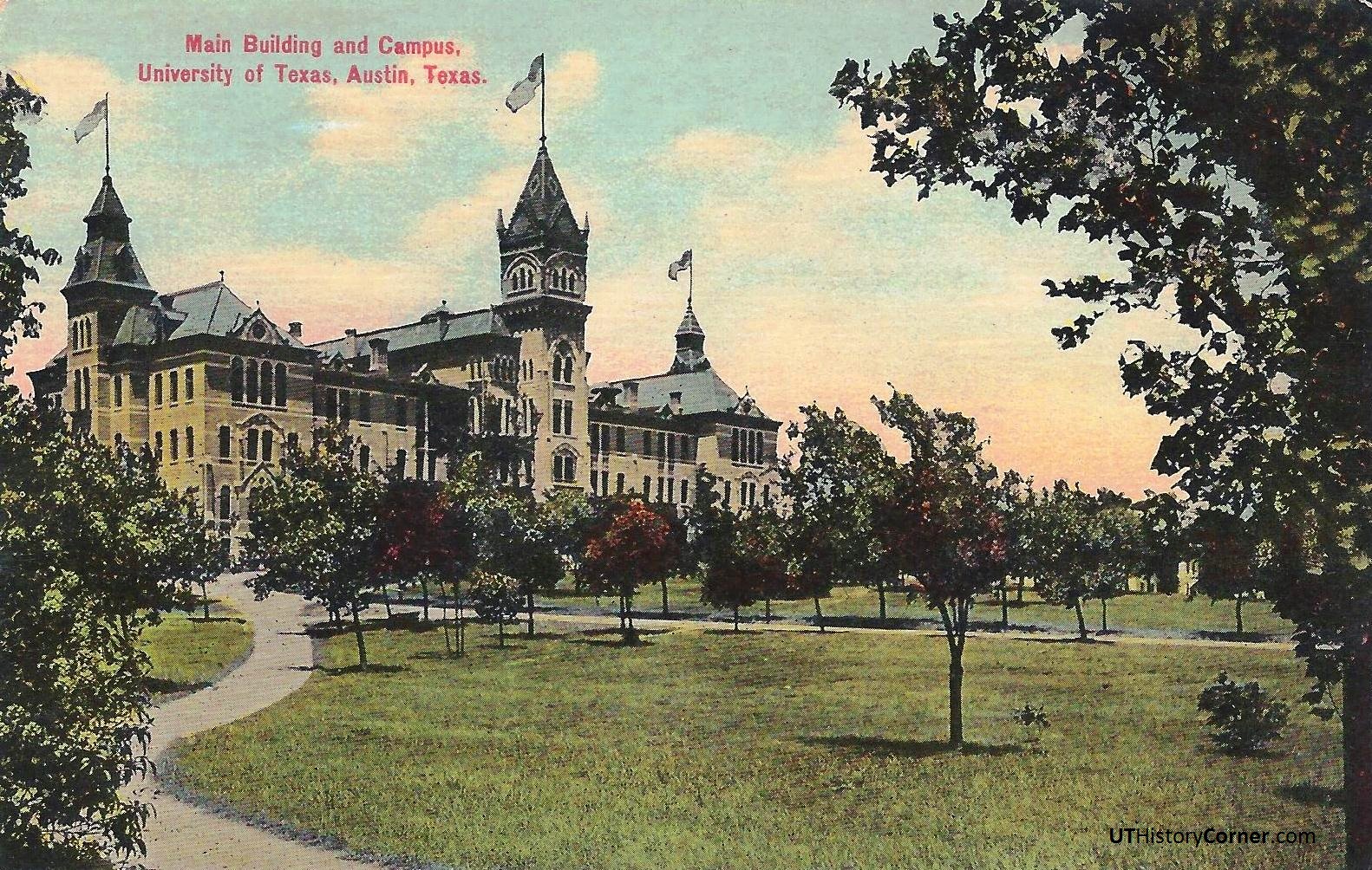 Other postcards from the same time period help us to imagine a visit to the 1907 campus. Here’s a view of Old Main from the southwest corner of the Forty Acres, near where the Harry Ransom Center stands today. On the far right, part of B. Hall can be seen behind the trees.