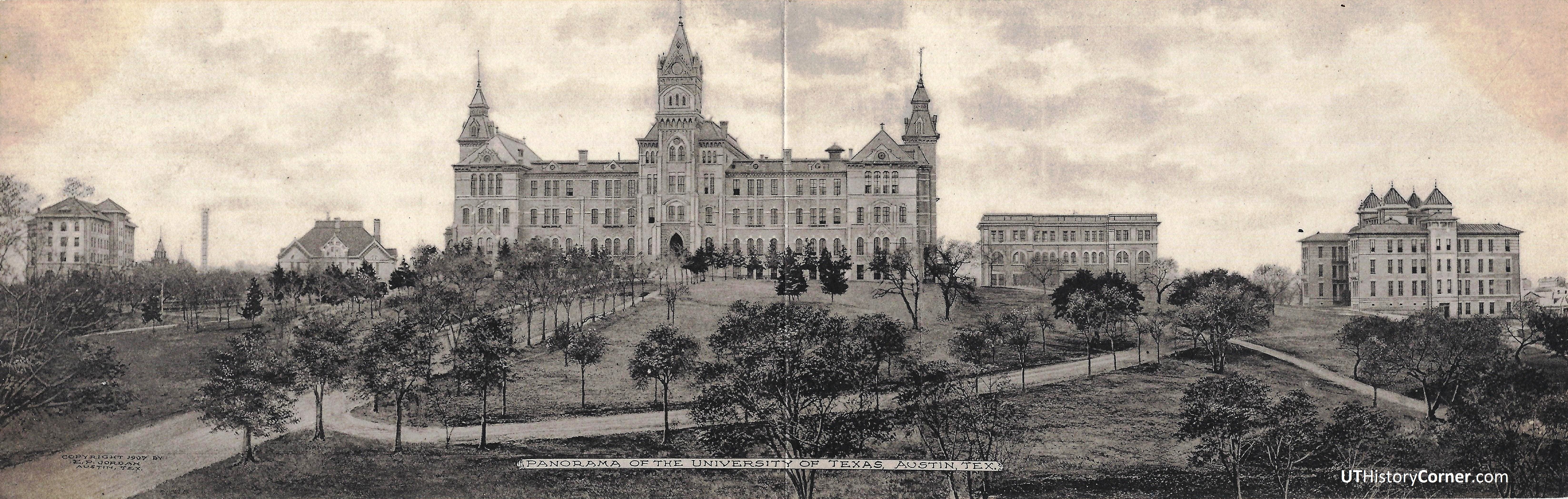 What’s on the campus? From left, you’ll find the Woman’s Building, the first residence hall for co-eds, built in 1902. It’s construction was somewhat controversial. At the time, many thought that women students would be better supervised by staying with families in Austin, and were opposed to on-campus housing. When a bill that included $50,000 for the building was introduced to Texas Legislature in 1901, the House was deadlocked in a tie and it required Speaker Robert Prince to cast the deciding vote. The Woman’s Building was later used for speech classes and the theater department before it burned in the 1950s.