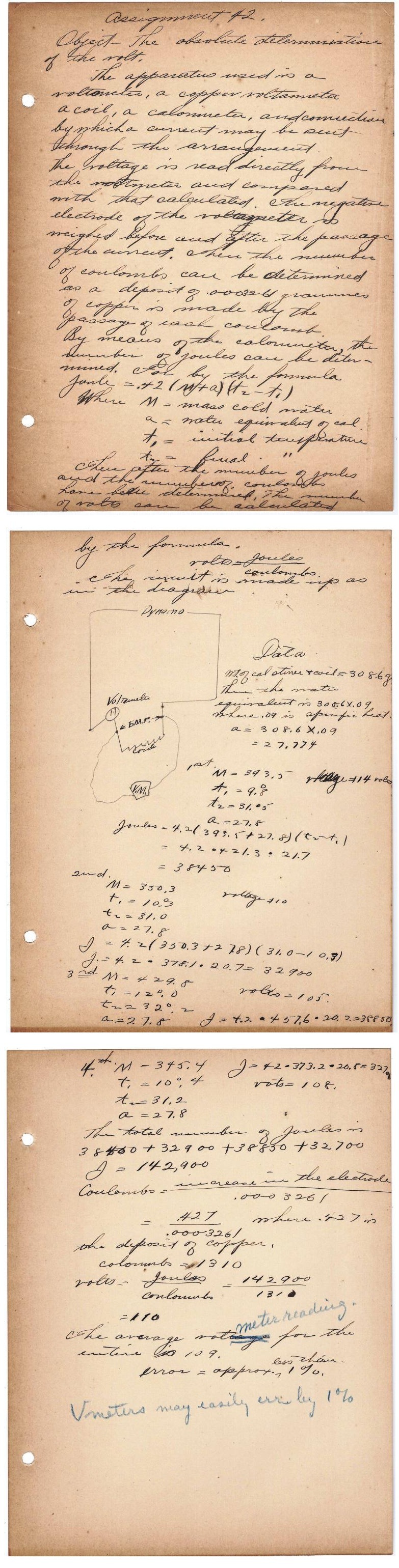 From the covers, it looks as if nearly 50 experiments were performed through the spring. Among them: to measure the radius of curvature of a convex lens, the absolute determination of the volt, to measure the resistance of a coil of wire at different temperatures, and to measure the EMF [ electromotive force – another term for “voltage” ] of a cell by the Potentiometer Method.