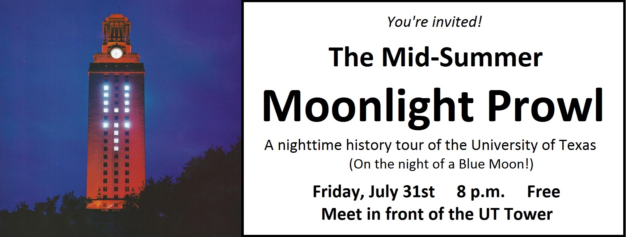 Everyone’s invited! The annual Mid-Summer Moonlight Prowl is scheduled for Friday, July 31st at 8 p.m. Not only is it – appropriately – the night of a full moon, it’ll be the second full moon in July, which makes it a blue moon. The “Blue Moon Prowl” will begin on the Main Mall in front of the UT Tower.