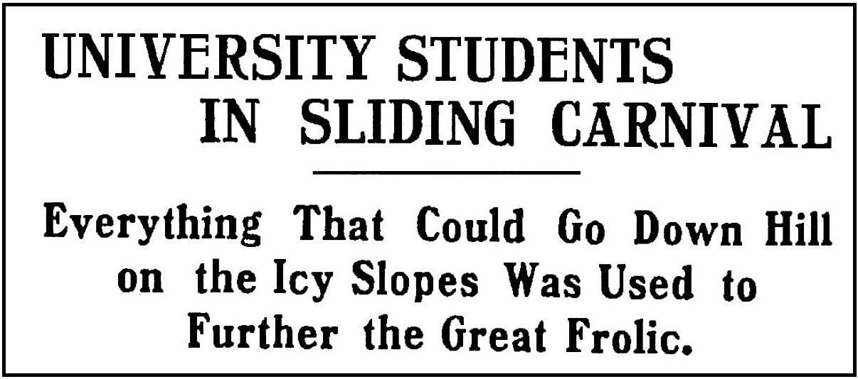 Law student Bill “Mogul” Robinson took the lead. The popular blond-haired football star hailed from Missouri. Upon his arrival in Texas, it was rumored that he “broke maidens’ hearts unintentionally and athletic records on purpose.” Robinson found an empty wooden cracker box, and after a few tries, succeeded in coasting down the hill east of Old Main to the doors of B. Hall, the men’s dorm. Fellow students were eager to get in on the fun, but Austin’s stores weren’t exactly well-stocked with winter sports gear. Since traditional sleds were scarce, other objects were pressed into service. Chairs were surreptitiously robbed of their legs and the remnants used as sliding seats. Soap boxes, planks, wash tubs, and even a table from the B. Hall cafeteria were sent careening down the glassy hillside overloaded with boisterous students. “The University turned a cold, freezing day into a hill-sliding jubilee,” declared the Austin Daily Statesman, which dubbed the spectacle “The Great Frolic.”
