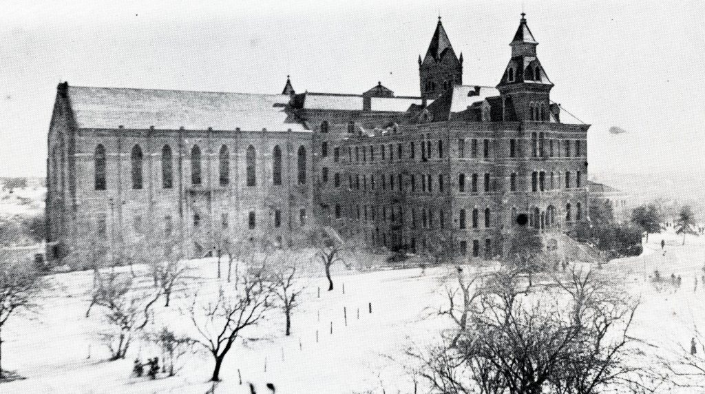 Above: The west side of a snow-covered old Main Building, seen from an upper floor in the Woman’s Building. The large north wing (on the left) housed the University Library on the first floor, and a 1,500 seat auditorium directly above.