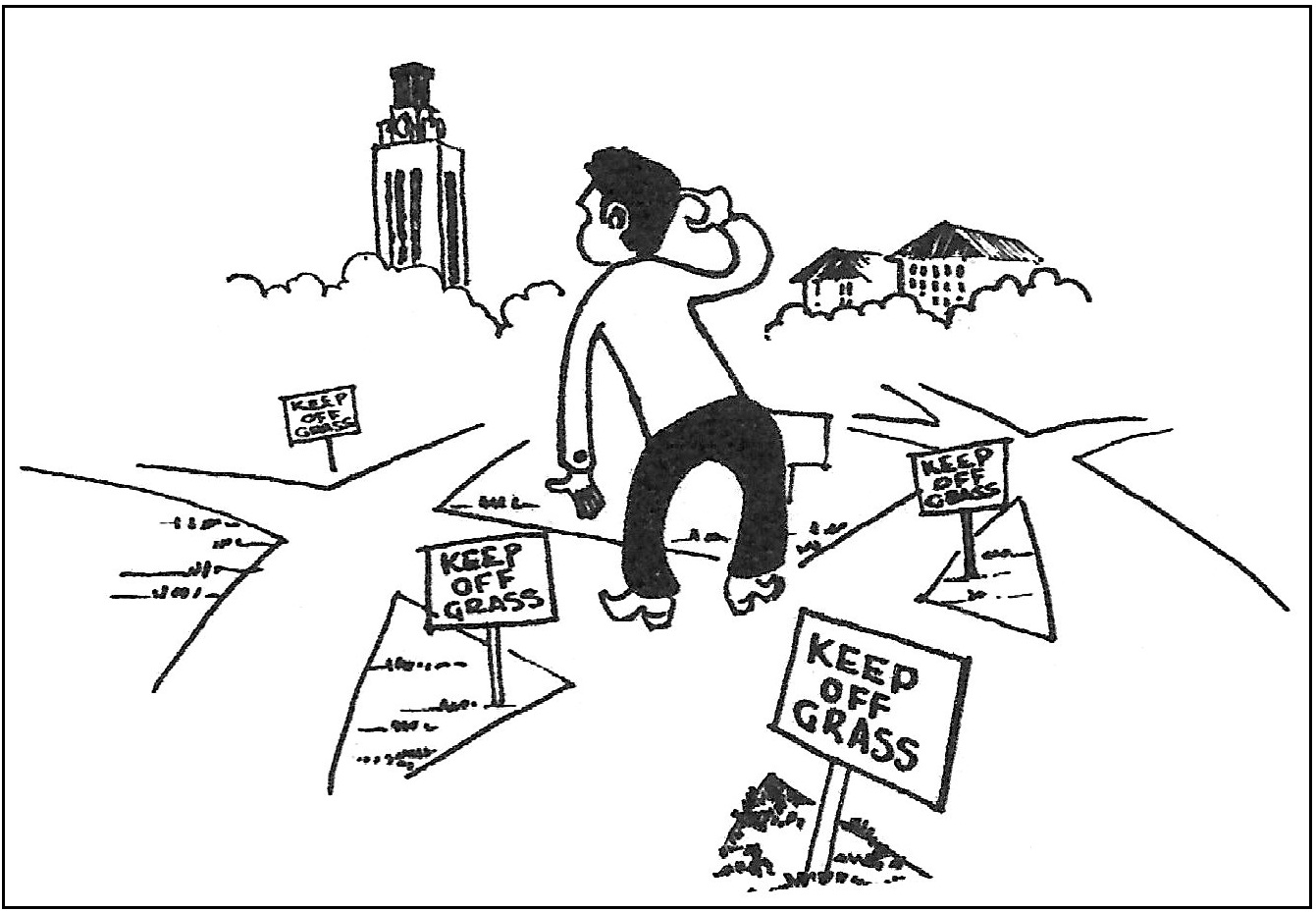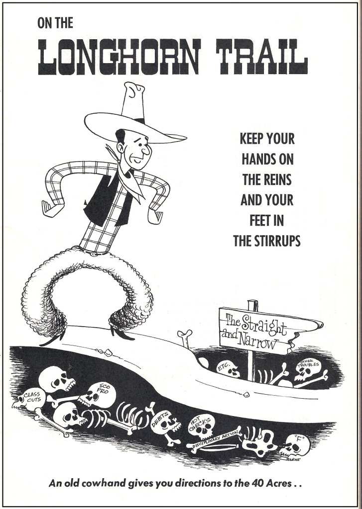 “Everybody has a tough time getting through first registration.  . . . The simplest way to get out of a jam is the best way. Just walk up to somebody and ask them what to do, where you should go, or whom you should see. Folks are naturally friendly at the University, like everywhere else in Texas. Collar somebody and start talkin’.”