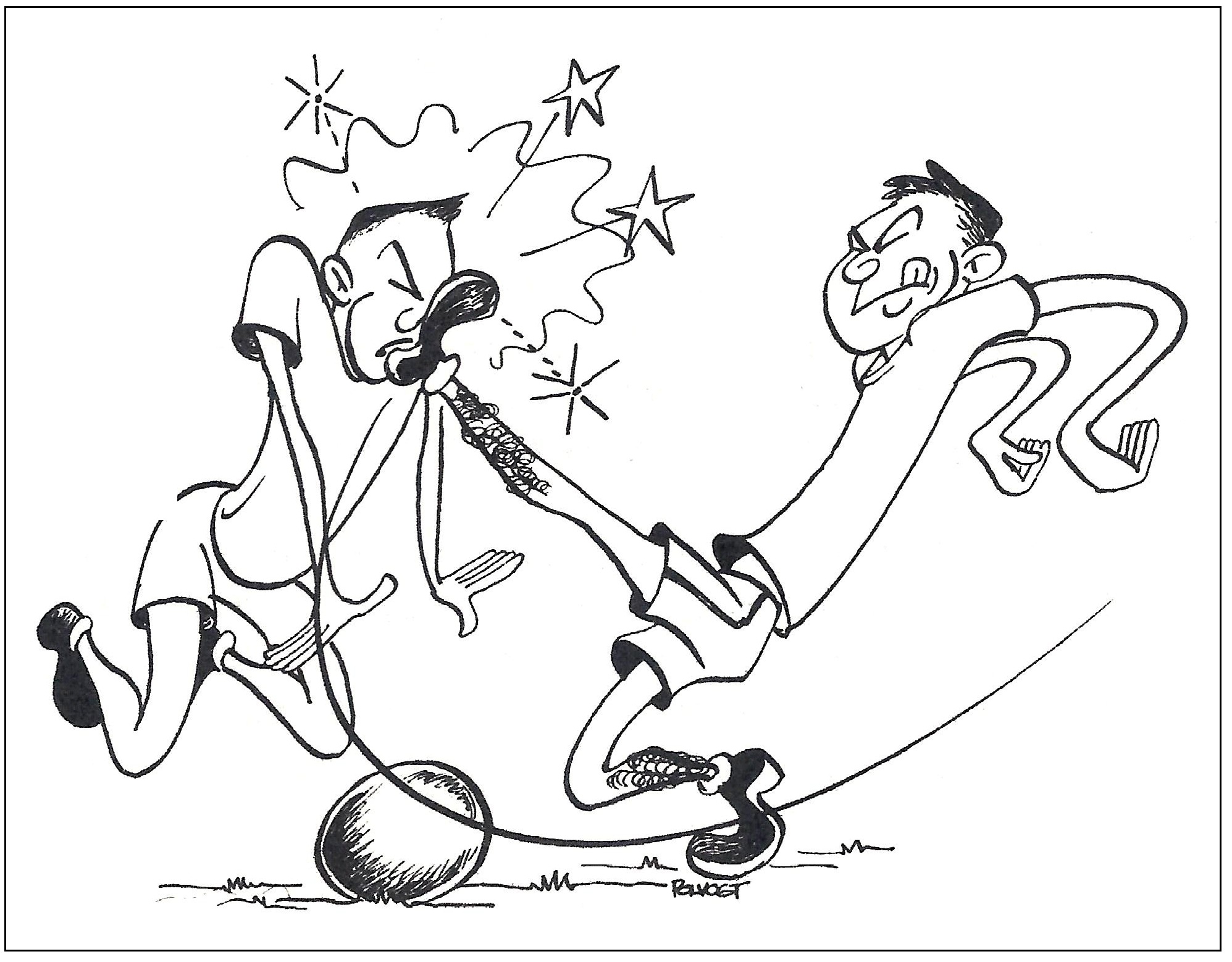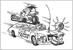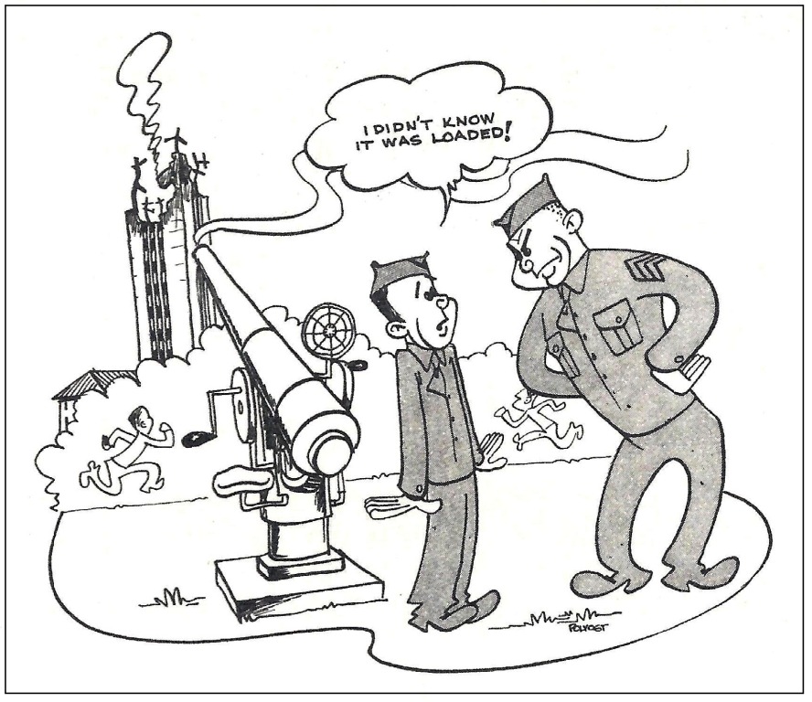 Left: The cartoon scene in this section of the freshman handbook wasn’t entirely fictional. From World War II until the 1957 completion of the ROTC Building on the East Mall (later named Russell Steindam Hall and now replaced by the Liberal Arts Building), the Naval ROTC was headquartered in the Littlefield Home, with a pair of anti-aircraft guns placed on each side of the front entrance. And in full view of the Tower.