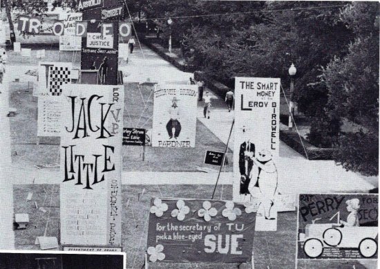 Above: For several weeks each semester, the all-grass West Mall was filled with enormous – and creative – campaign signs for student government. Click on an image for a larger view.