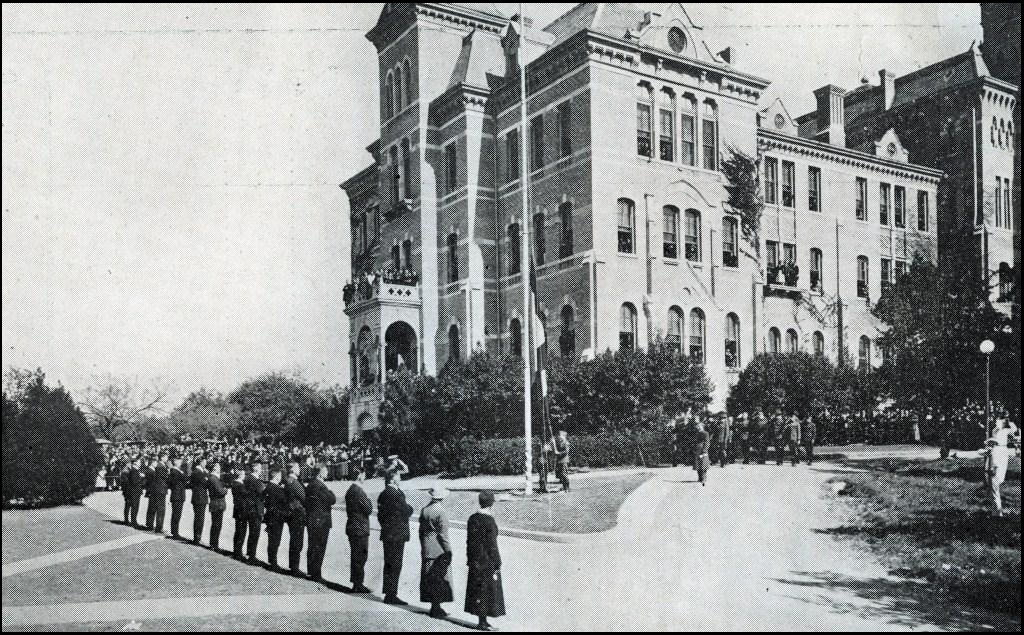 One year after the war ended, on Friday, November 14, 1919, the university held a “Patriotism Day” memorial. At noon, in accordance to “General Order No. 1 as issued by President Robert Vinson,” classes were dismissed, and all students, faculty and staff assembled in military style in front of Old Main, where, for the first and only time, the service flag had been hung on the university’s flag pole.