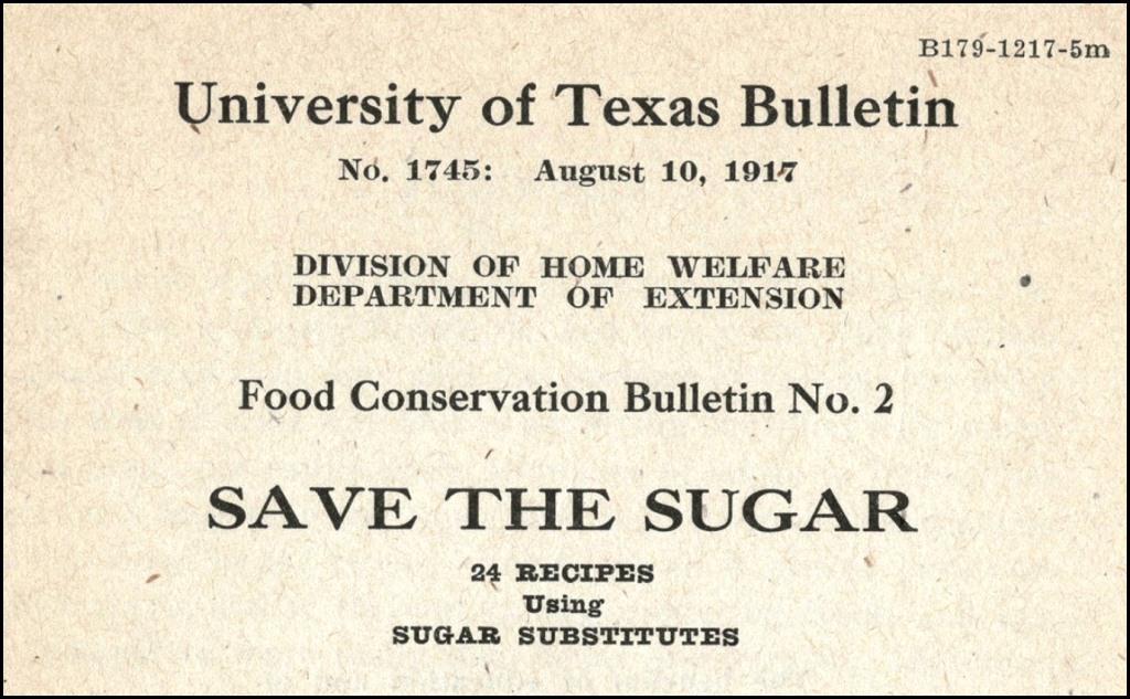 Above: The “Save the Sugar” bulletin was one of four in a series. Other bulletins were filled with recipes – created and tested on campus – to conserve wheat, meat, and fat.
