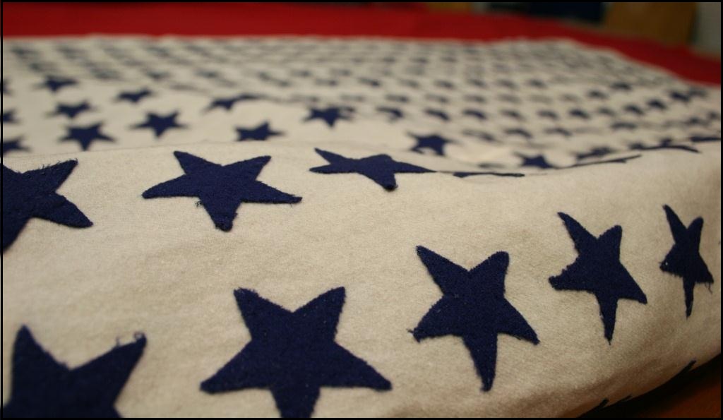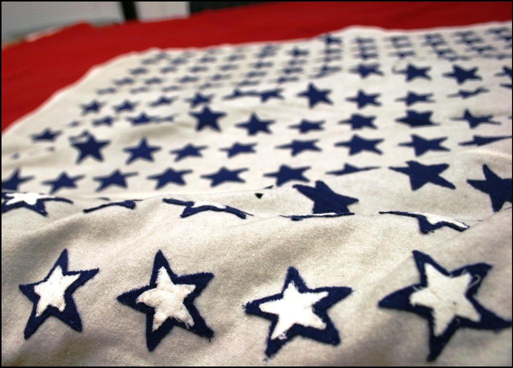 The flag required a full two weeks of labor, with volunteers divided into 15-person shifts. Made from “a fine grade French flannel,” the entire flag measured 10 1/2 x 16 feet. The white center was 6 1/2 x 12 feet, and was initially filled with 1,570 blue stars. Each was 1 1/2 inches tall, individually traced, cut, placed, and hand sewn in meticulous straight lines. While Captain Queissner’s original service banner was intended to be hung against a wall or in a window, with the blue star visible only on one side, the ladies elected to make the university’s version a true flag, so that two star fields were created, attached back-to-back, and a two-foot wide red border sewn around it.