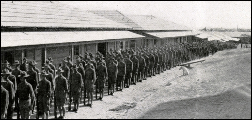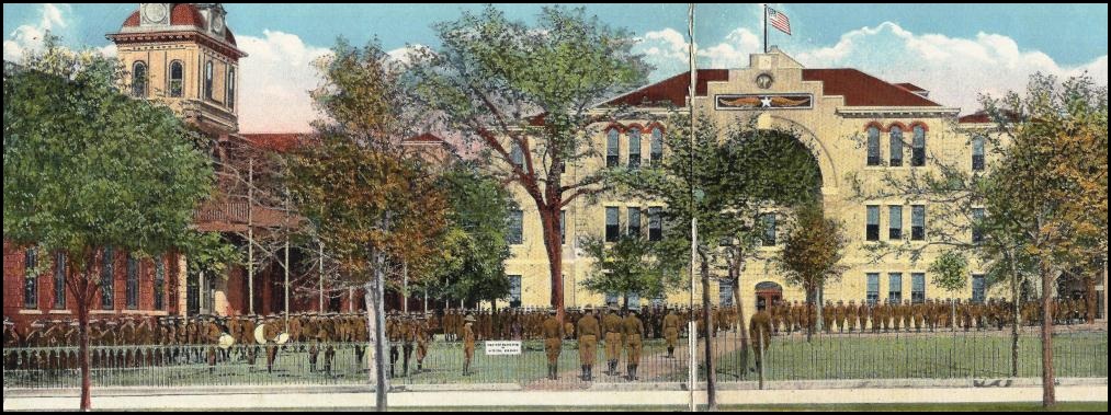 Above: Members of the UT Student Army Training Corps fall in to formation in front of a row of wooden barracks along the west side of Speedway (where Waggener Hall and the McCombs School are today). On the hill to the right, Pig Bellmont, UT’s first live mascot, inspects the troops.
