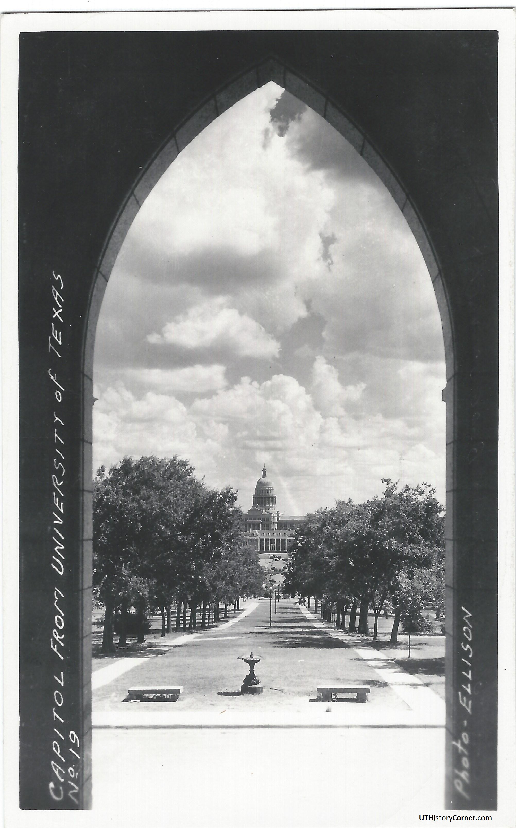 The view of of the Texas Capitol from a fourth floor window in the west wing of the old Main Building, around 1905. The tree-lined drive entered the campus from University Avenue and 21st Street (where the Littlefield Gateway is today), made its way up to the front of Old Main, then circled back around and out to the south.