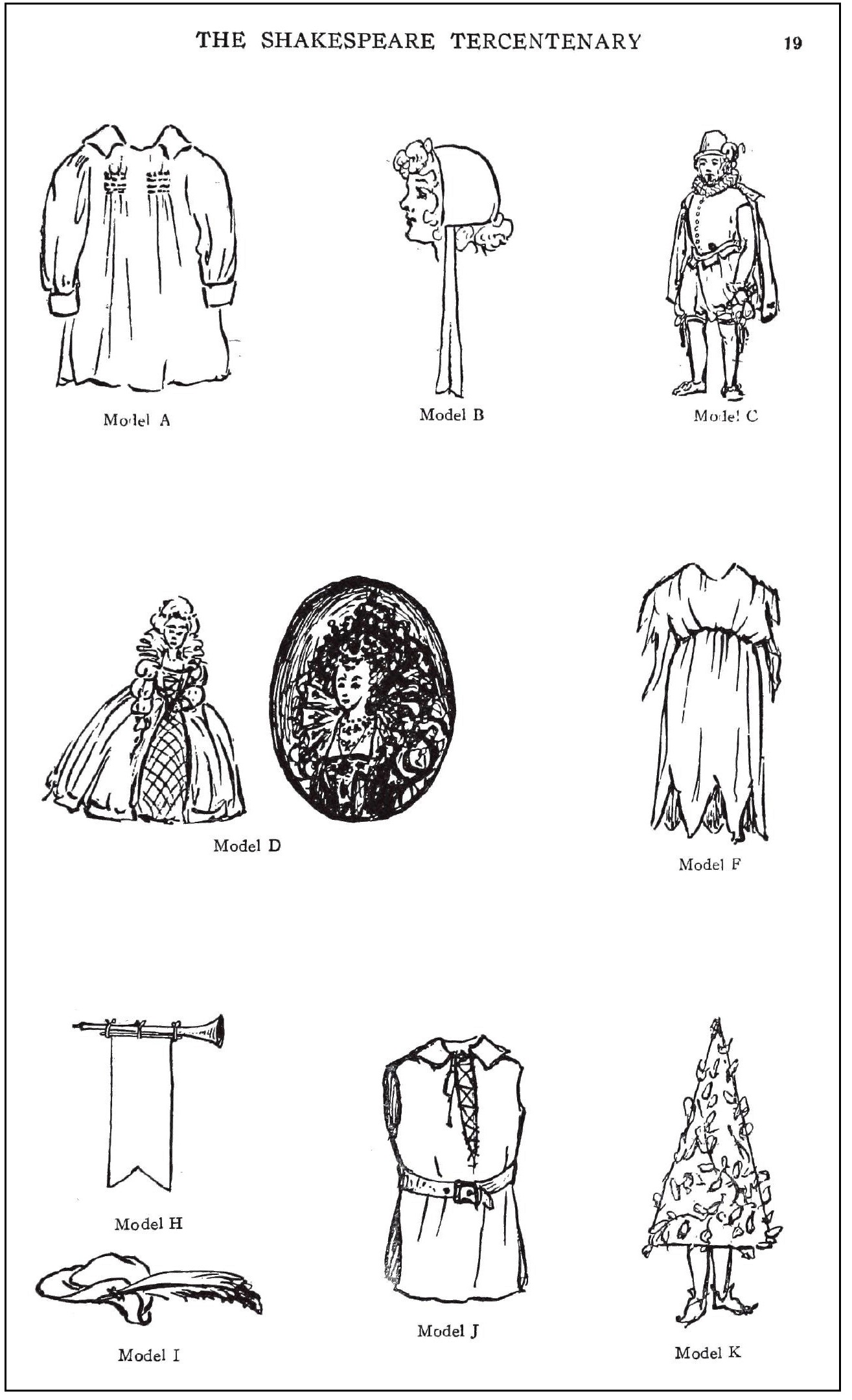 In 1914, at its annual conference in Chicago, the Drama League of America discussed the upcoming 300th anniversary of Shakespeare’s death in 1916 and voted to bring about “a great national Shakespeare Tercentenary Celebration.” The group didn’t have the resources to coordinate a single, coast-to-coast effort. Instead, it encouraged local events organized by communities, schools, and colleges. It held press conferences, contacted civic organizations, and published pamphlets filled with ideas for parades, day-long Shakespeare festivals, music and steps to old English dances, and ideas for easily-made Elizabethan costumes (image at right).