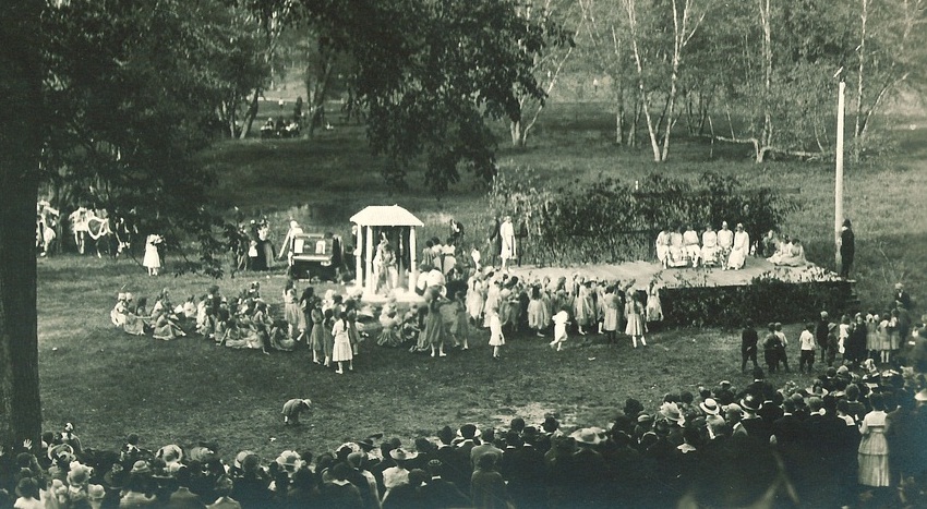 boasted five performances of As You Like It with a cast of 1,000 persons, the University of Iowa organized a well-attended outdoor festival (photo at left). Commemorative parks were dedicated, schoolchildren learned Morris dances, and Shakespeare parties were a national fad.