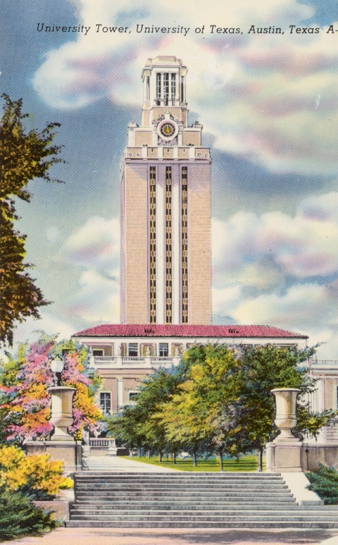 Today, “Shakespeare” adorns the University’s Main Building. Constructed in the 1930s to serve as the central library, the names of fourteen literary giants – Aristotle, Homer, Cervantes, Moliere, and Mark Twain, among them – were symbolically engraved in limestone along the east and west walls. Shakespeare was placed in the northeast corner. And, just in case more UT-Shakespeare connections were needed, Paul Cret, the architect of the Main Building and Tower, was also the designer of the Folger Shakespeare Library in Washington, D.C. Cret was finishing his plans for the Shakespeare Library just as the University hired him to be its consulting architect.
