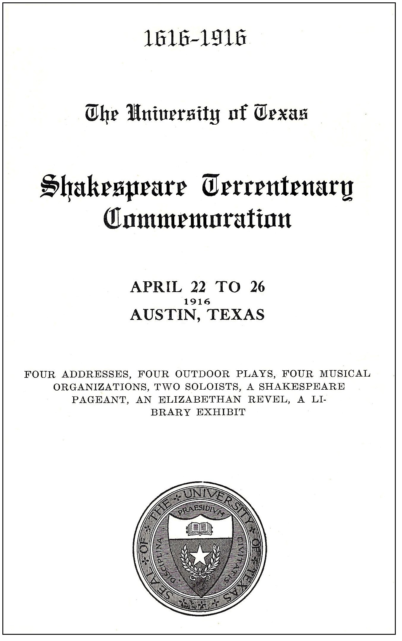 Most organizers took their cues from the Drama League and sponsored one or two of the published suggestions: a parade and performance of a play, for example, or an academic lecture as part of a library exhibit. But Shakespeare was especially welcome in Austin. The University of Texas did them all, and more.
