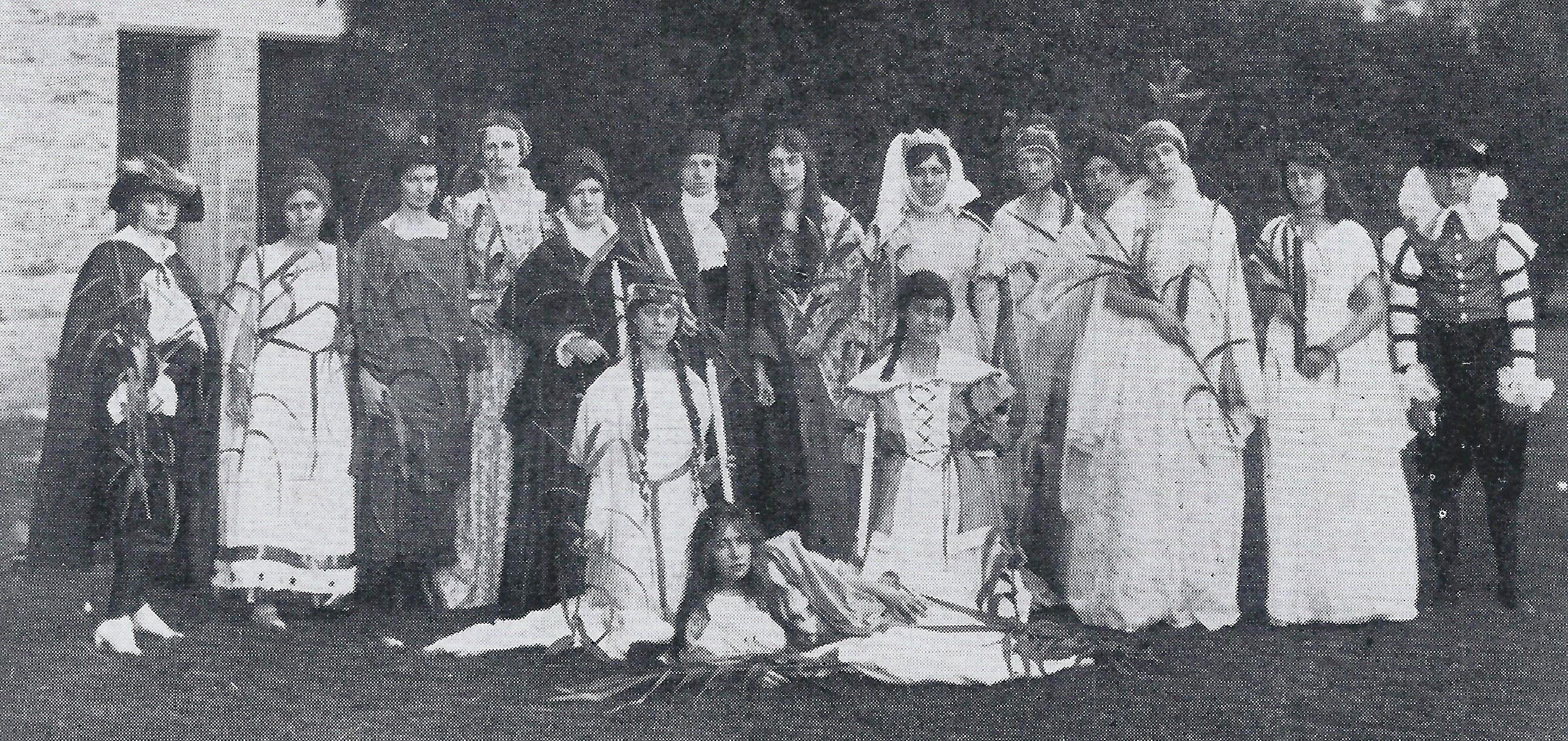 Above: With Grace Denny as Rosalind (far left), natural sciences students portray As You Like It. All are holding young corn stalks, meant to depict the trees in the forest of Arden.