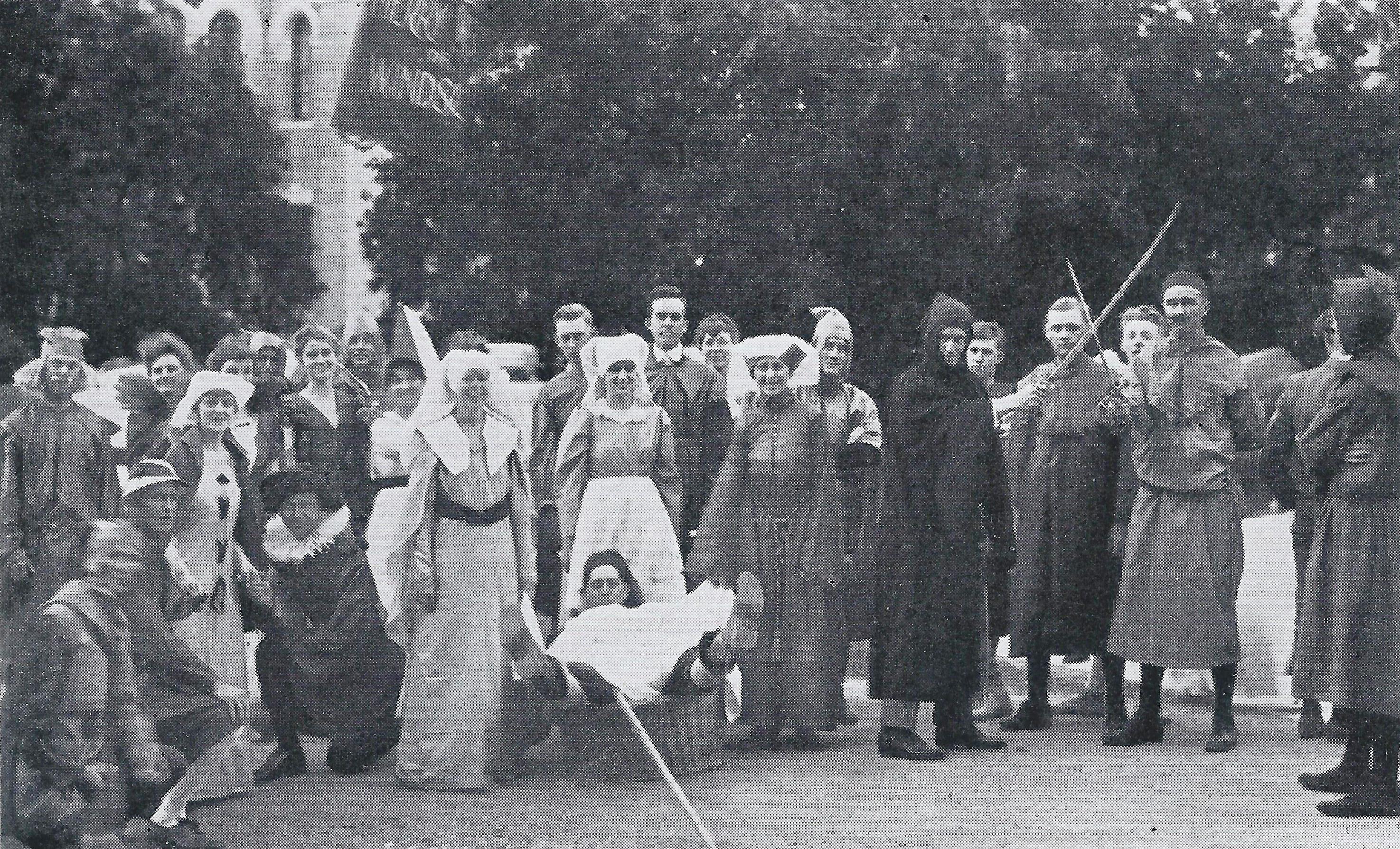 Before long, a pageant committee had organized, chaired by home economics professor Mary Gearing and composed of faculty, wives of professors, and friends of the University. The committee created a dozen parade units, depicting either scenes from plays or snapshots of Shakespeare’s life, and assigned each to an academic department or student organization. To visually distinguish each group, the committee went so far as to select “color schemes” for the costumes.