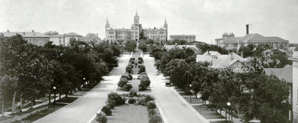 Above: The Forty Acres in the 1890s as seen from 21st and Guadalupe Streets. Old Main is in the middle of the campus, with B. Hall to the right.