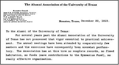 It wasn’t the usual holiday greeting. Less than a week before Christmas, on December 20, 1910, University of Texas Alumni Association President Ed Parker (right) wrote a bluntly candid letter to his fellow graduates. “The Association has at this time,” he explained, “no complete records, no fixed habitation, no funds, no really effective organization.” Alumni dues were a dollar a year, but no one bothered to pay them. The treasury had been empty since 1905 and the office of treasurer left vacant. “That such a condition should not be permitted to continue does not admit of argument.”