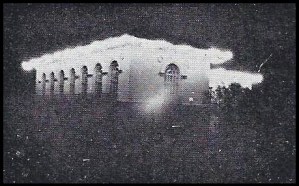 To prepare the campus, “the Senior Engineers have strung thousands of electric globes along the main walks,” reported the Austin Statesman. Additional strings of alternating orange and white lights were hung under the eaves of the new Library (above right) and the front of the old Main Building was brightly floodlit. The parade wound up at a wooden stage just west of Old Main, where the participants were entertained by skits and songs performed by UT students.