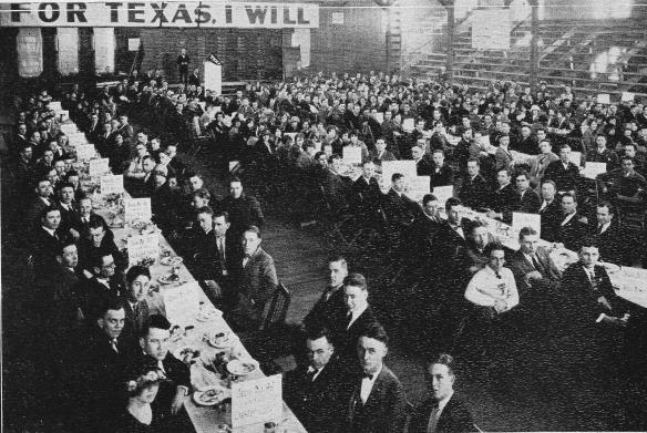 With the stadium drive underway, 500 students were divided into 68 teams to solicit anyone and everyone on campus. The group met for lunch daily at the men’s gym, under an enormous “For Texas, I Will” banner hung on the east wall, and reported on pledges from the previous day. Each morning, The Daily Texan published a different slogan above its masthead, while the contributor won a pair of tickets to a local movie theater. Among the refrains:
