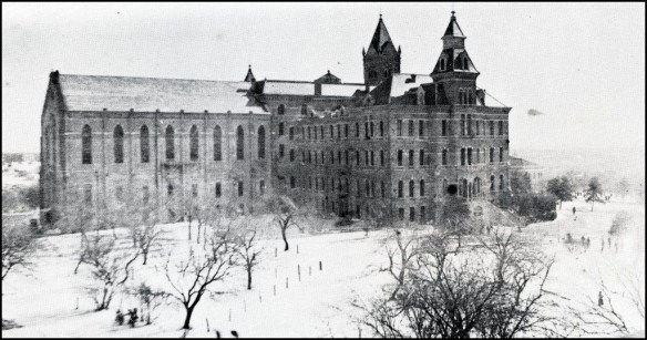 Faculty, too, occasionally fell into trouble and needed Clark’s help. One of them was the rusty-haired Thomas Taylor (photo at left), hired in September, 1888 to teach applied mathematics as well as courses in mechanical drawing. His classroom in the old Main Building was on the third floor, directly above the library, and was outfitted with drafting tables, chairs, and a faucet and sink for cleaning the drawing equipment after class. Austin’s water works, though, weren’t always reliable in the 1880s, and the water pressure was often insufficient to make it to the third floor.