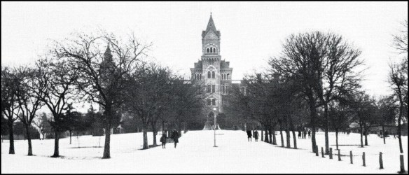 Among his many contributions to the University, Clark was perhaps best known for his Christmas Dinners. For almost a decade after the University opened, only Christmas Day was allowed as a holiday. Students repeatedly complained, argued there wasn’t enough time to travel home and return to campus before classes resumed, and petitioned the faculty for a week-long holiday. In 1891, the faculty at last acquiesced. Most of the students fled the campus for home, but there were still a few, all of them residents of B. Hall – the men’s dorm – who didn’t have the funds for a train ticket.