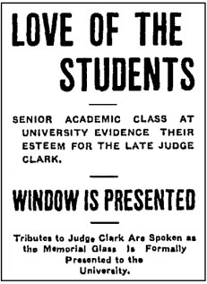 Above: The senior class of 1909 donated a stained glass window in memory of James Clark. It was initially installed in a place of honor, above the south entrance of the old Main Building. In the 1930s, when Old Main was razed and replaced by the current Main Building and Tower, the window was preserved and can be seen just inside the Office of the Dean of Graduate Studies on the first floor.