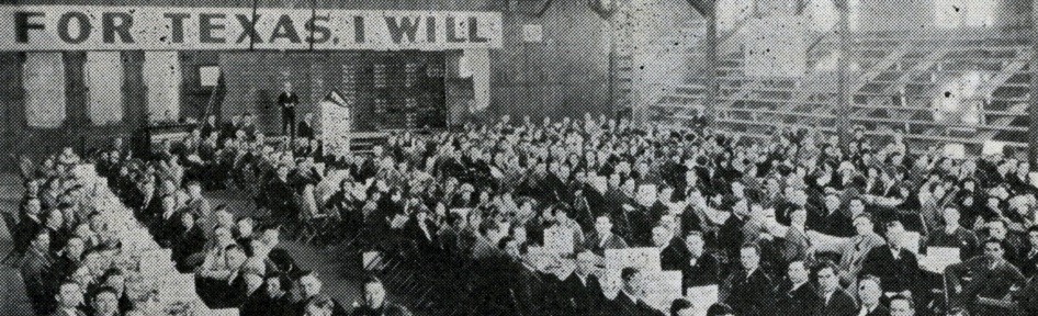 With the stadium drive underway, 500 students were divided into 68 teams to solicit anyone and everyone on campus. The group met for lunch daily at the men’s gym, under an enormous “For Texas, I Will” banner hung on the east wall, and reported on pledges from the previous day. Each morning, The Daily Texan published a different slogan above its masthead, while the contributor won a pair of tickets to a local movie theater. Among the refrains: