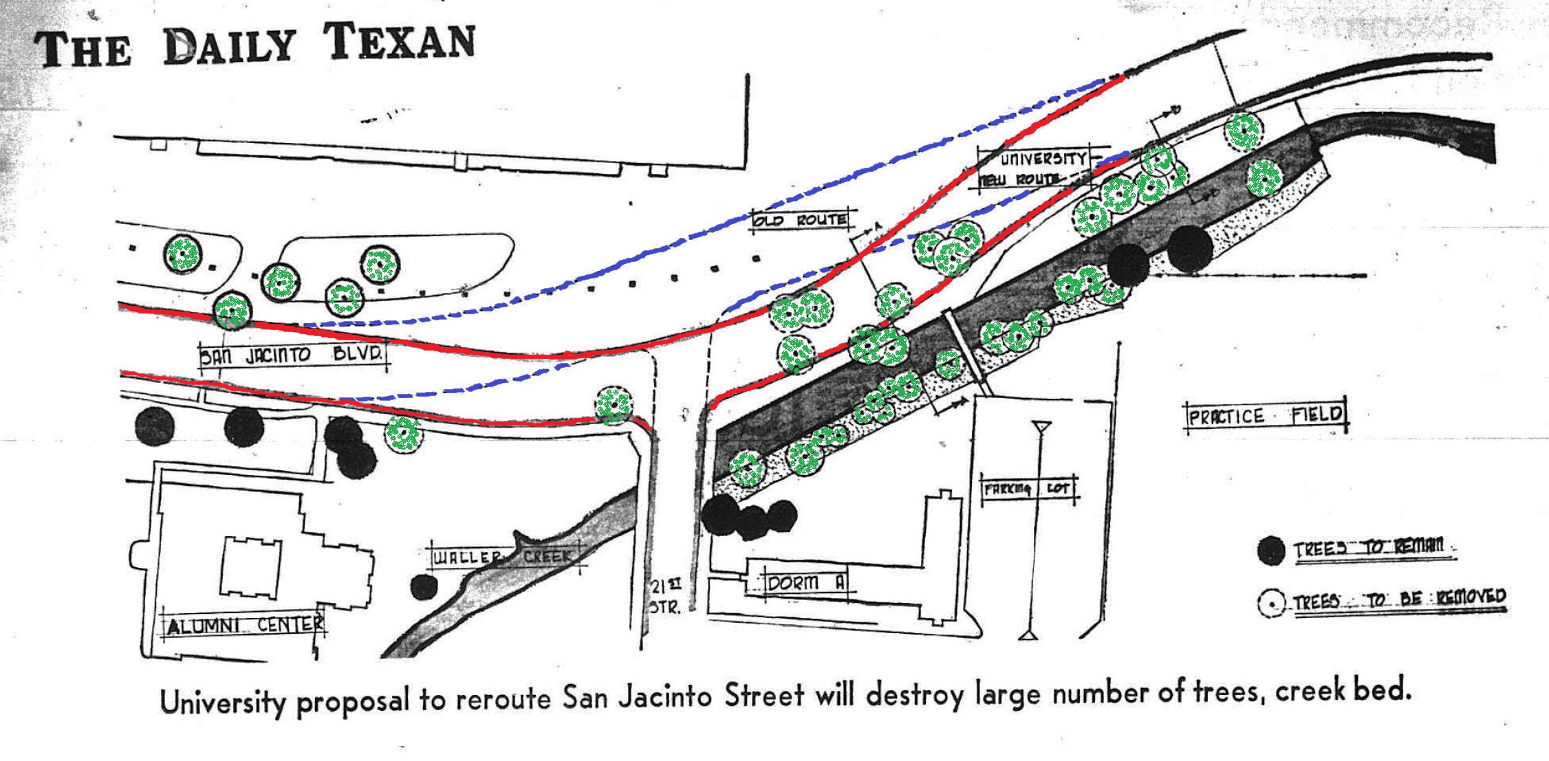 Above: The plan to redirect San Jacinto Boulevard, published in The Daily Texan. (Color is mine.) East is up and north to the left. The stadium, before the addition of Bellmont Hall, is seen in the upper left, with the alumni center across the street. Lower right, Dorm A and the parking lot have since been replaced by the San Jacinto Residence Hall, and the practice field is today’s Clark Field. Blue marks the original route, while red indicates the altered, and current, position of the street. Green circles specify the 39 trees removed. Click on the image for a larger version.