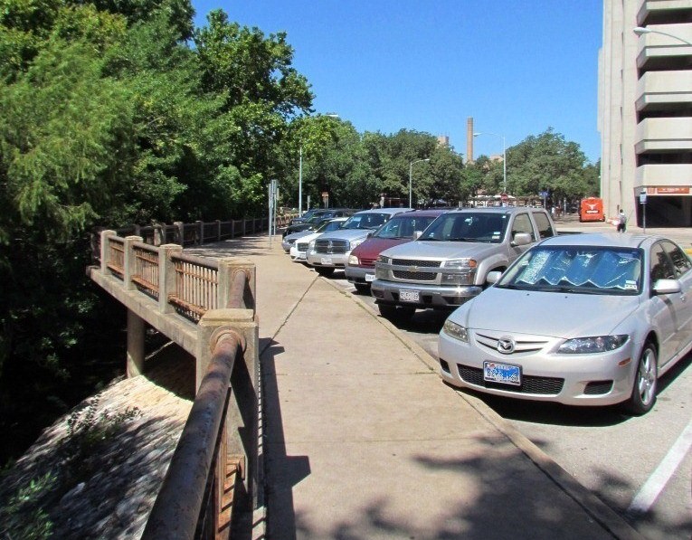 Careful! Look close, or you might miss it. Take a stroll along the sidewalk, heading north on San Jacinto Boulevard as it approaches the football stadium. The street makes a long, lazy curve as it follows the route of Waller Creek, just to the west. But as you near the stadium, where the creek straightens out for a bit, the road makes a slight veer to the left. The sidewalk that once shadowed the creek’s bank from a polite distance is abruptly pushed over and rudely intrudes out over the embankment, supported by concrete pillars.