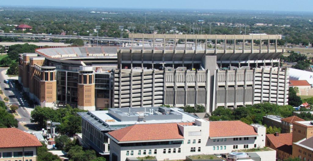 Bellmont Hall, as seen from the UT Tower observation deck, provides the support for second-tier seating on the stadium’s west side.