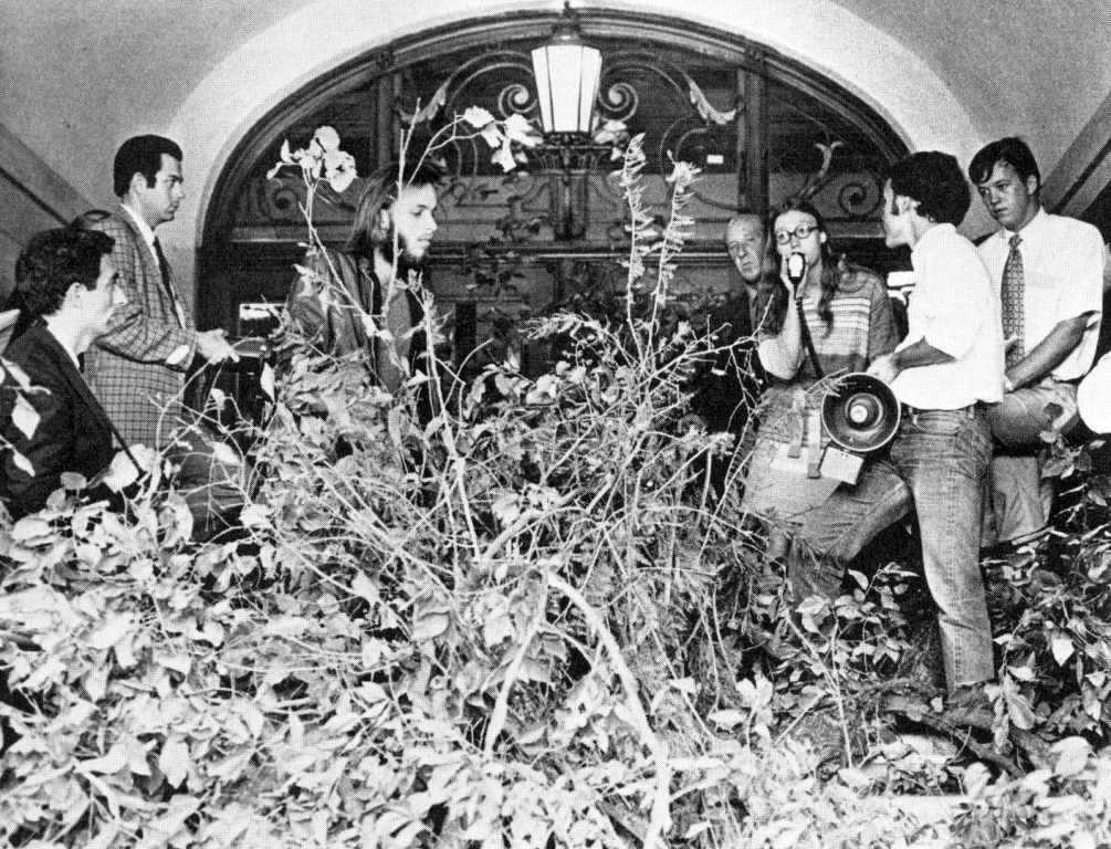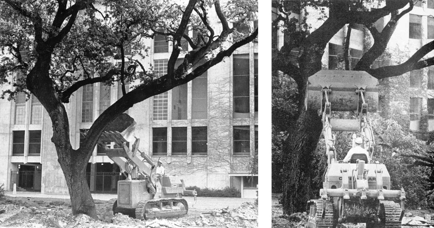The students, though, were not yet finished. As the construction crews retreated and broke for lunch, several hundred persons grabbed branches, large and small, towed them out of the creek bed, up the 21st Street hill, through the South Mall, and up to the Main Building. As the students approached, administrators feared the worst and locked the doors as the branches were piled in the entryways. A rally on the Main Mall followed, and President Hackerman agreed to meet with a small delegation. Hackerman did what he could to ease the situation, and arranged for students to meet with Erwin the following day. The University’s campus planning office announced that no more trees would be removed, and, as a concession to the students’ demands, the bed of Waller Creek would not be paved as originally proposed.