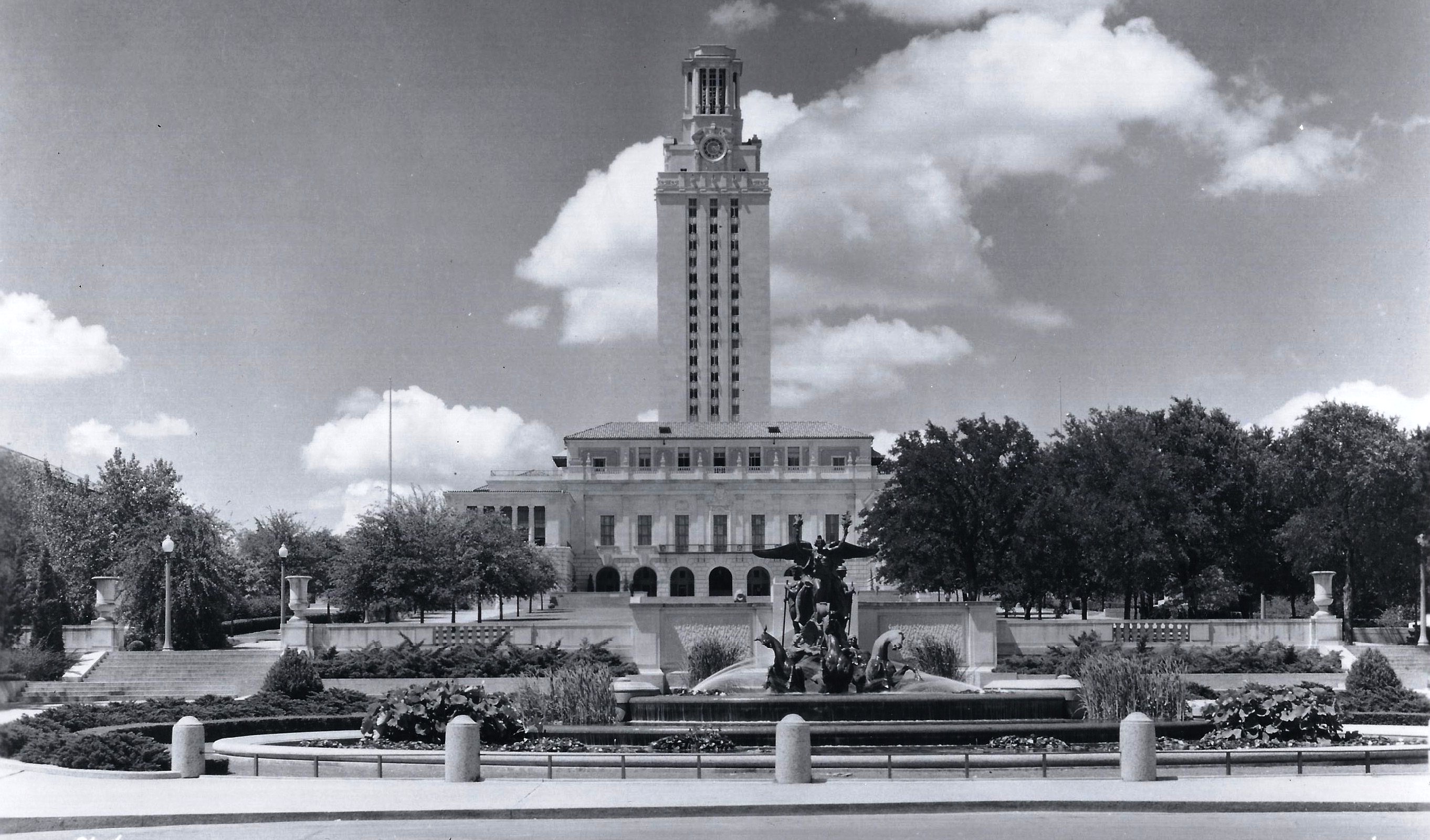 As the fall semester opened, an all-white Tower was more often seen. Eckhardt began to use the orange lights sparingly, as reported by the Statesman, “confined to those times when the campus is visited by out-of-town and out-of-state groups, or when the university sponsors some annual event.” This included the June 1938 commencement ceremonies, held for the first time on the Main Mall, when the top portion of the Tower glowed orange to honor the graduates.