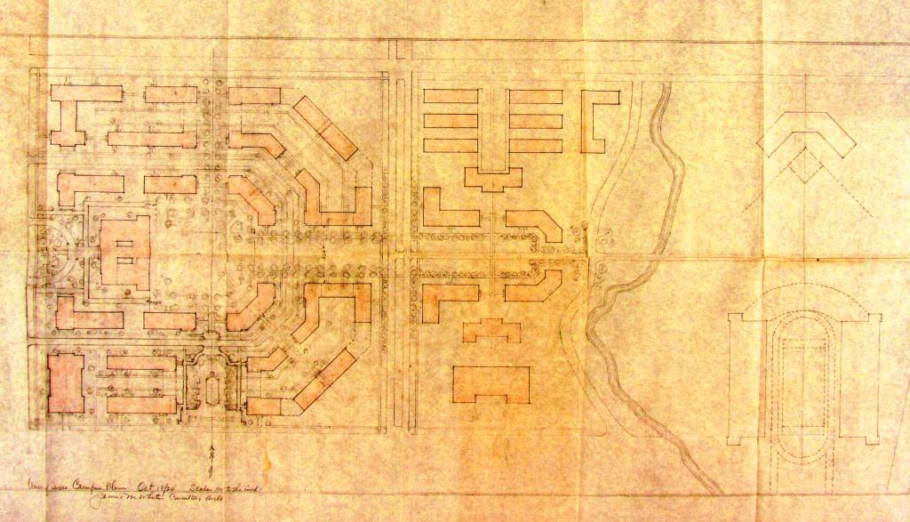Above: The 1933 campus master plan for the University of Texas. The Tower is the focus, from which malls extend in the four cardinal directions. (The North Mall wasn’t implemented.) UT Buildings Collection, Alexander Architectural Archives, UT Austin.